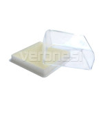 Realizado en plástico . Base de color blanco y tapa en color transparente con bordes redondeados.