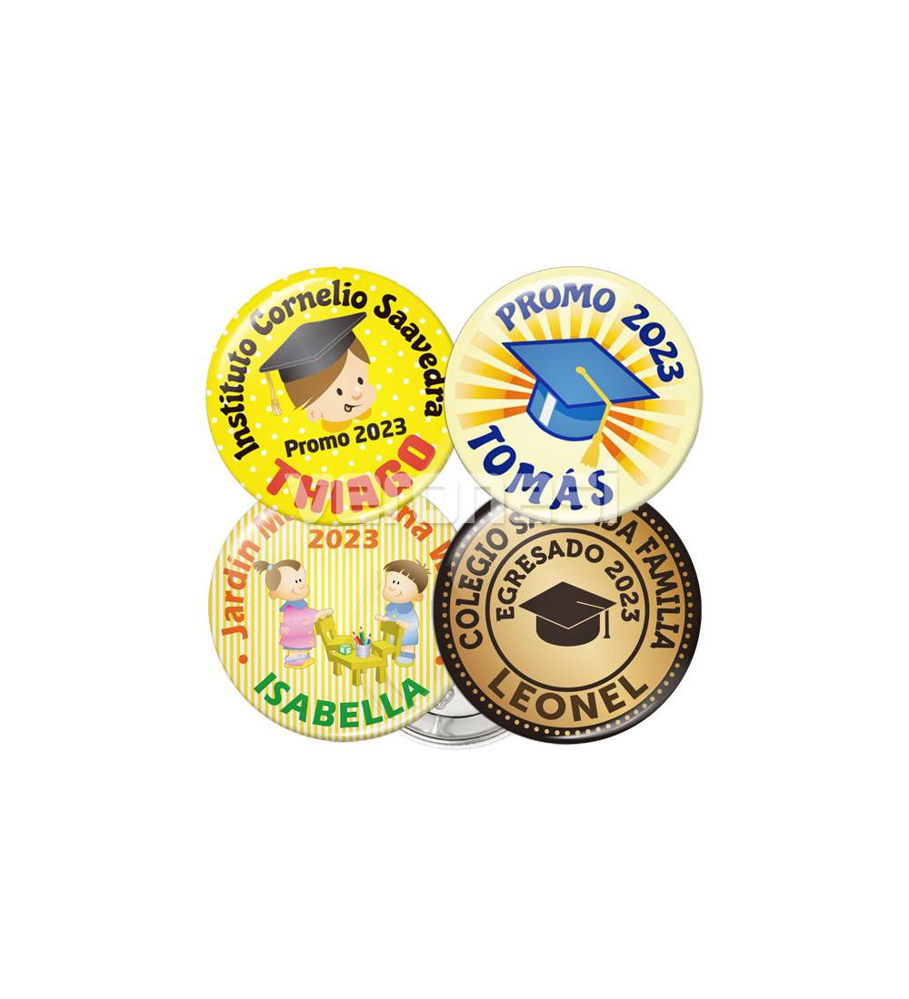 Los diseños personalizados permiten colocar el nombre de cada alumno y datos del establecimiento en cada botón.