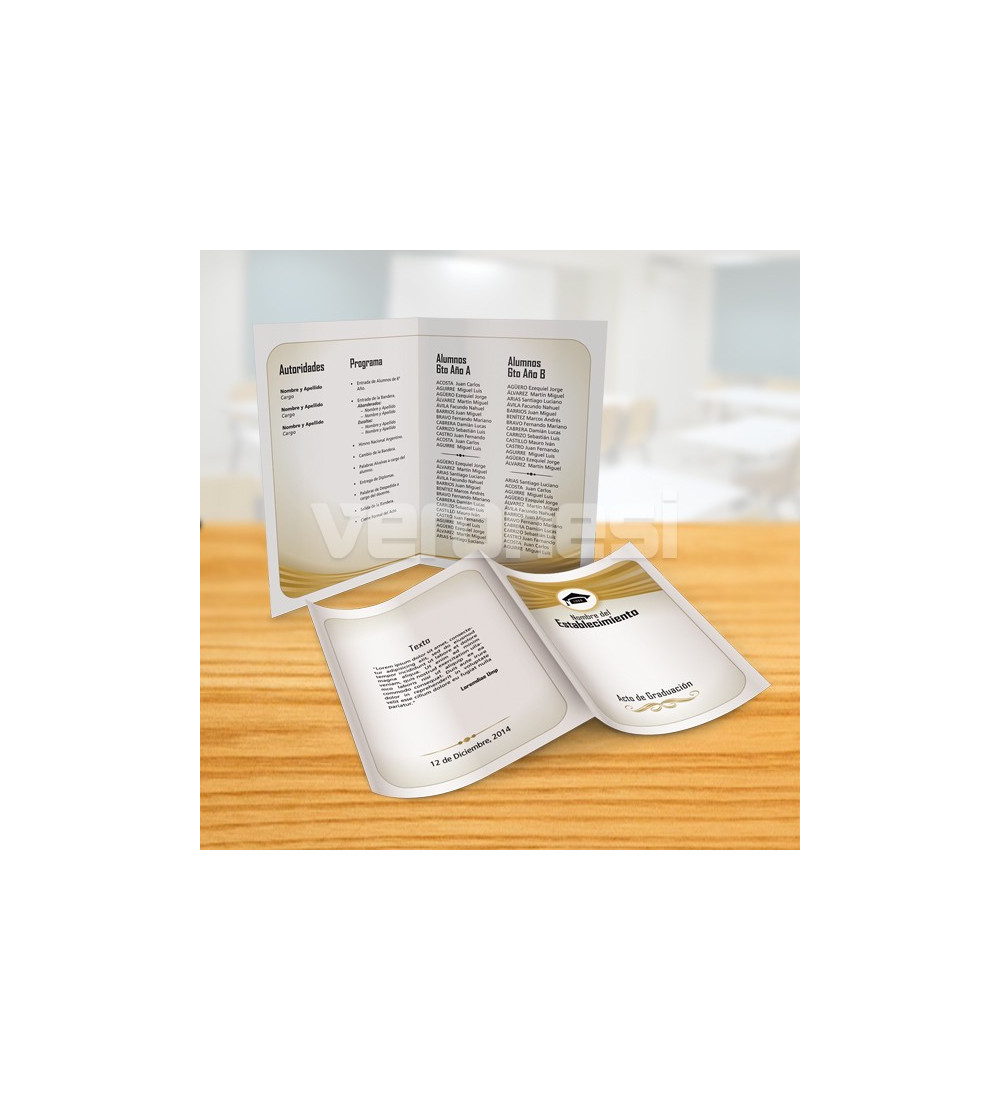 Retiro GRATIS en nuestra sucursalPrograma impreso en papel obra con diseño en dorado.