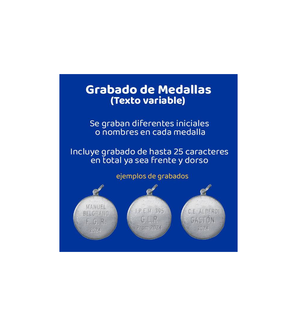 Tener en cuenta que la superficie de la medalla es limitada por lo que se sugiere que el grabado no supere los 25 caracteres y/o letras en total