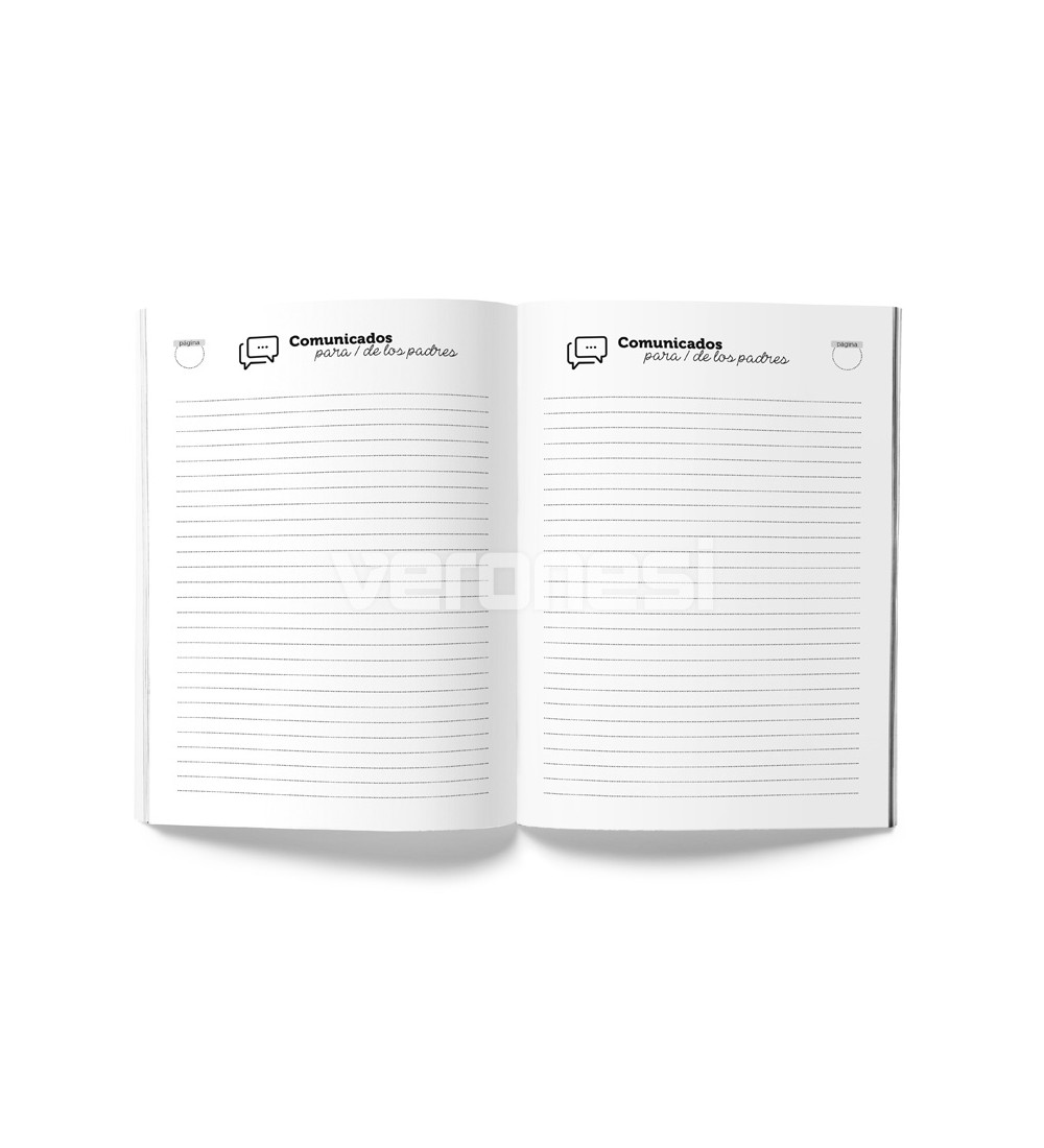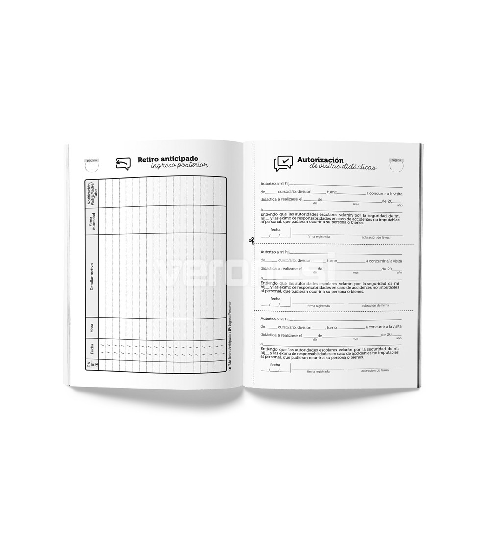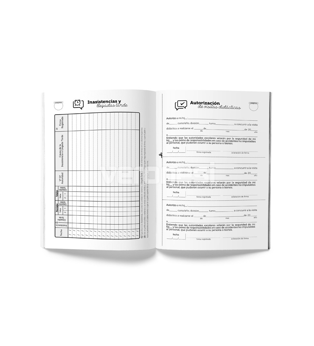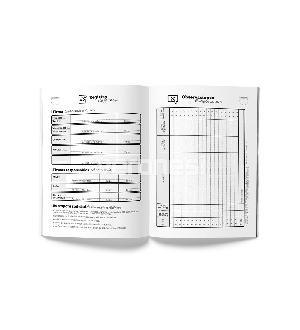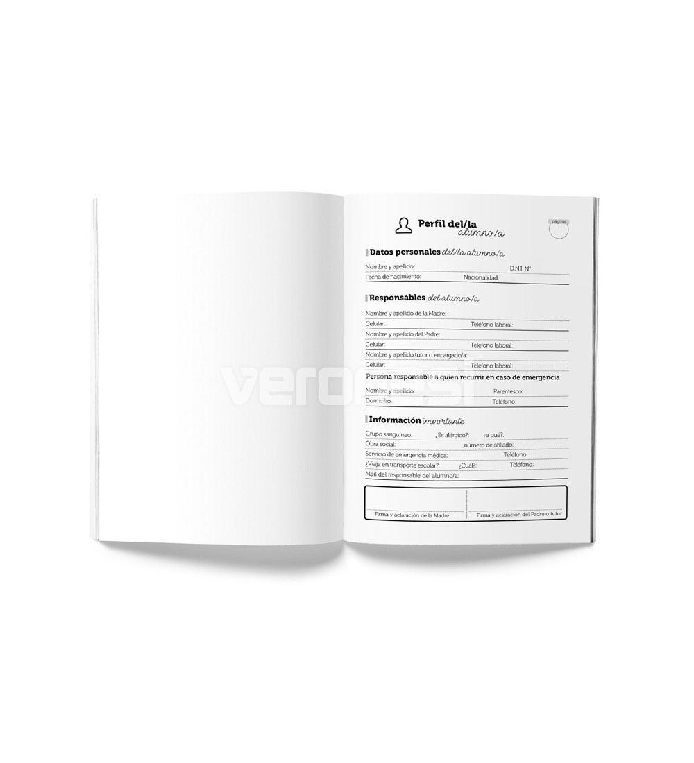 Tapa: cartulina 180 grs / 2 colores (con campos para personalizar el nombre del establecimiento, apellido/nombre del alumno/a, curso, división y turno)